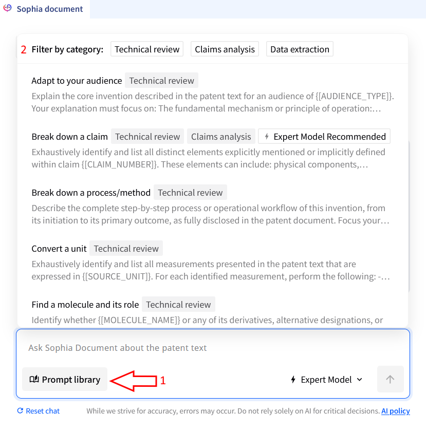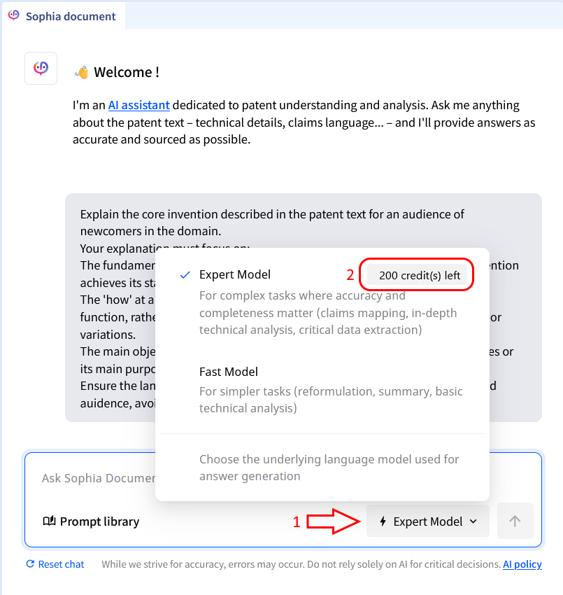 Some prompts will produce a better and more precise results with the Expert model activated. This model is able to manage the whole fulltext (except the most larger patent, see last section below) and efficiently sifting this content to find exactly what you are requesting.