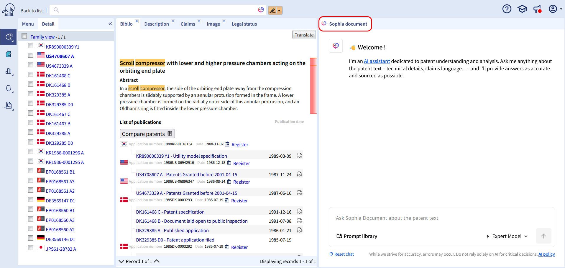 When you open the Sophia Document tab, by default a “representative member” of the patent family is selected for chatting. Please see your user settings / Display section if you want to change this default selection. To chat with a different family member, click its name in the left panel; the center panel will reload with its context.