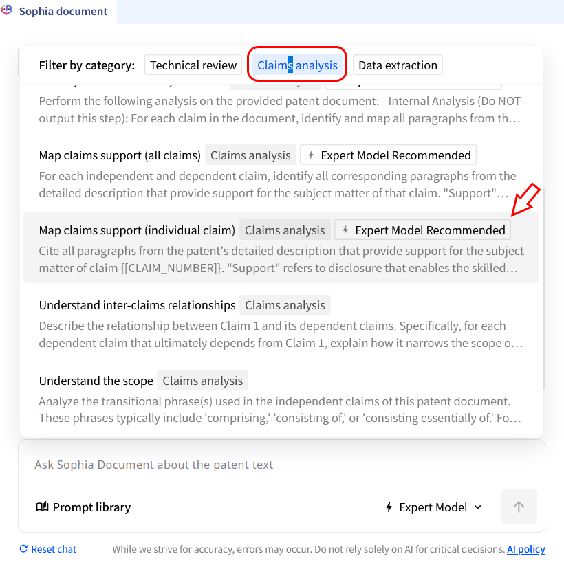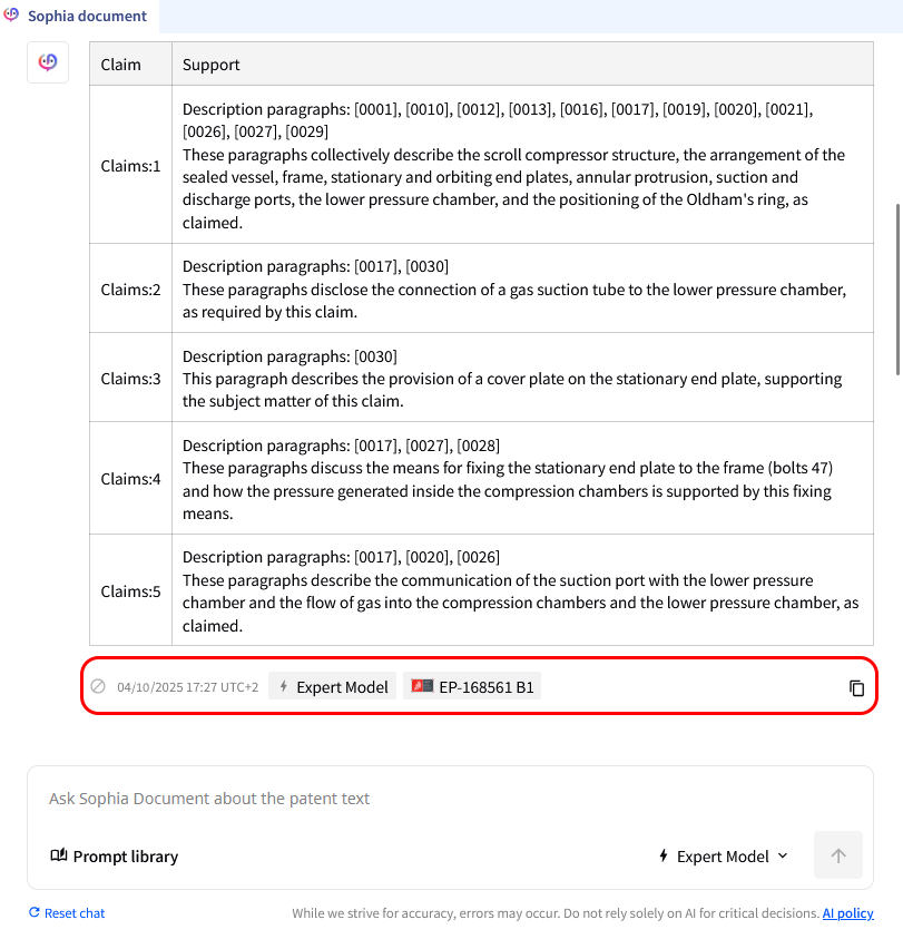 Sophia document will always make links to paragraphs and claims numbers, to source its answer with the patent's fulltext.