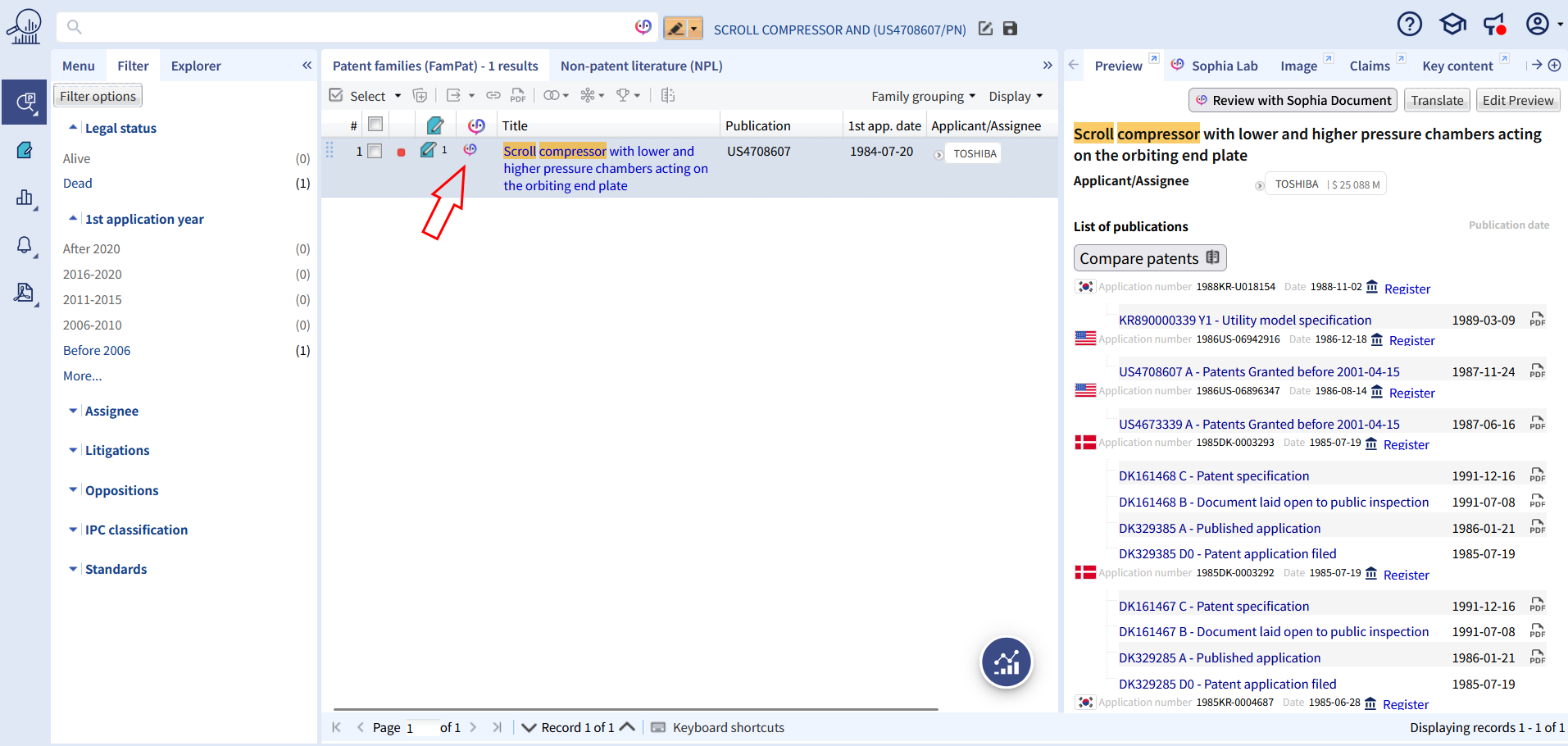 In a hitlist, you can see which patent families have active chats ; a dedicated Sophia icon appears between the Workfiles icon and the legal status indicator.
