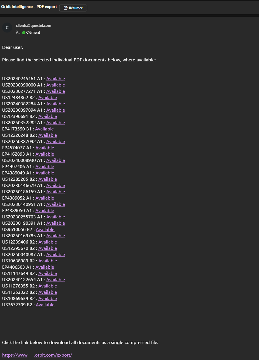 Note: This export is handled as an order. The request is sent to our providers, and Orbit retrieves all available PDFs from the various sources. Therefore, we cannot guarantee 100% availability of PDFs.