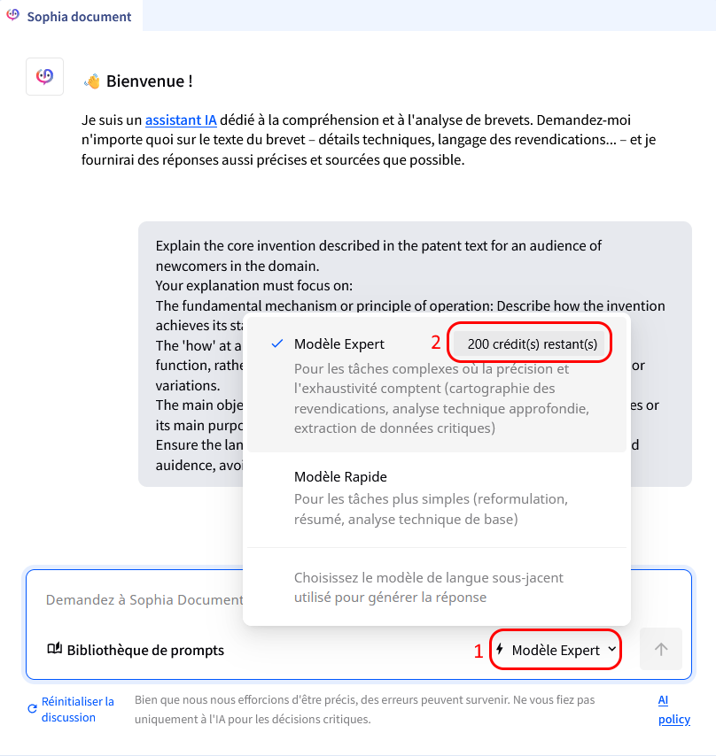 Sophia Document est disponible avec les niveaux Advanced et Premium. Chaque niveau ouvre droit à un certain nombre de crédits. Pour vérifier de combien de crédits vous disposez, dans la zone de saisie, il faut changer le modèle de langage utilisé tel que :