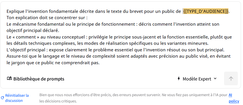 Limitations contextuelles : L’analyse du chatbot est limitée au texte qu’il analyse. Les brevets extrêmement longs (par exemple 200 pages avec un contenu technique dense) peuvent dépasser ce que le LLM peut entièrement gérer - chaque modèle possède ses limites intrasèques en quantité de texte.