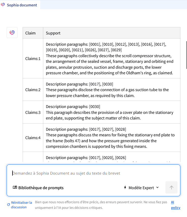 Sophia Document fera toujours des liens et références vers les paragraphes ou revendications du brevet, afin de toujours sourcer ces propos.