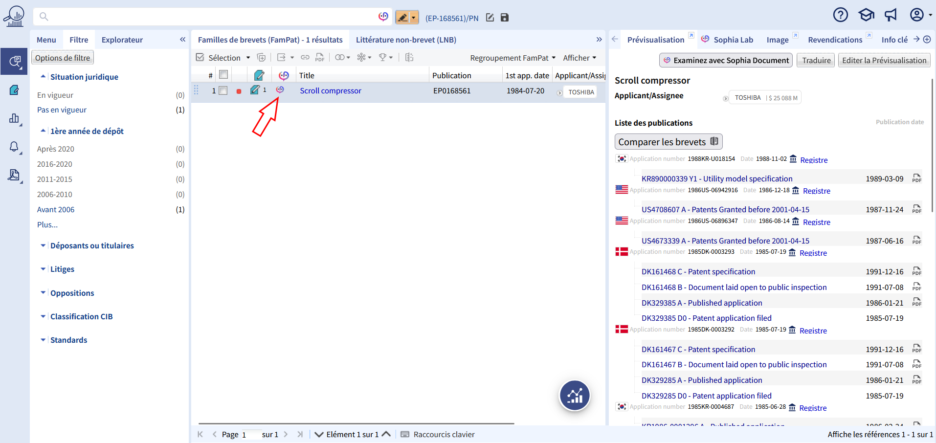 Il est possible de continuer ou commencer à échanger avec un autre brevet de la famille, simplement en changeant sur le membre voulu depuis le panneau latéral gauche ( onglet "Détail") . Le panneau central sera alors rechargé pour afficher le contenu de ce document, et les questions posées à Sophia Document porteront désormais sur ce document.