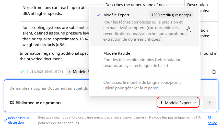 ⚠️ Sophia Document repose sur un système de crédits. Un crédit est utilisé à chaque fois qu'une génération de réponse est produite en utilisant le modèle Expert.