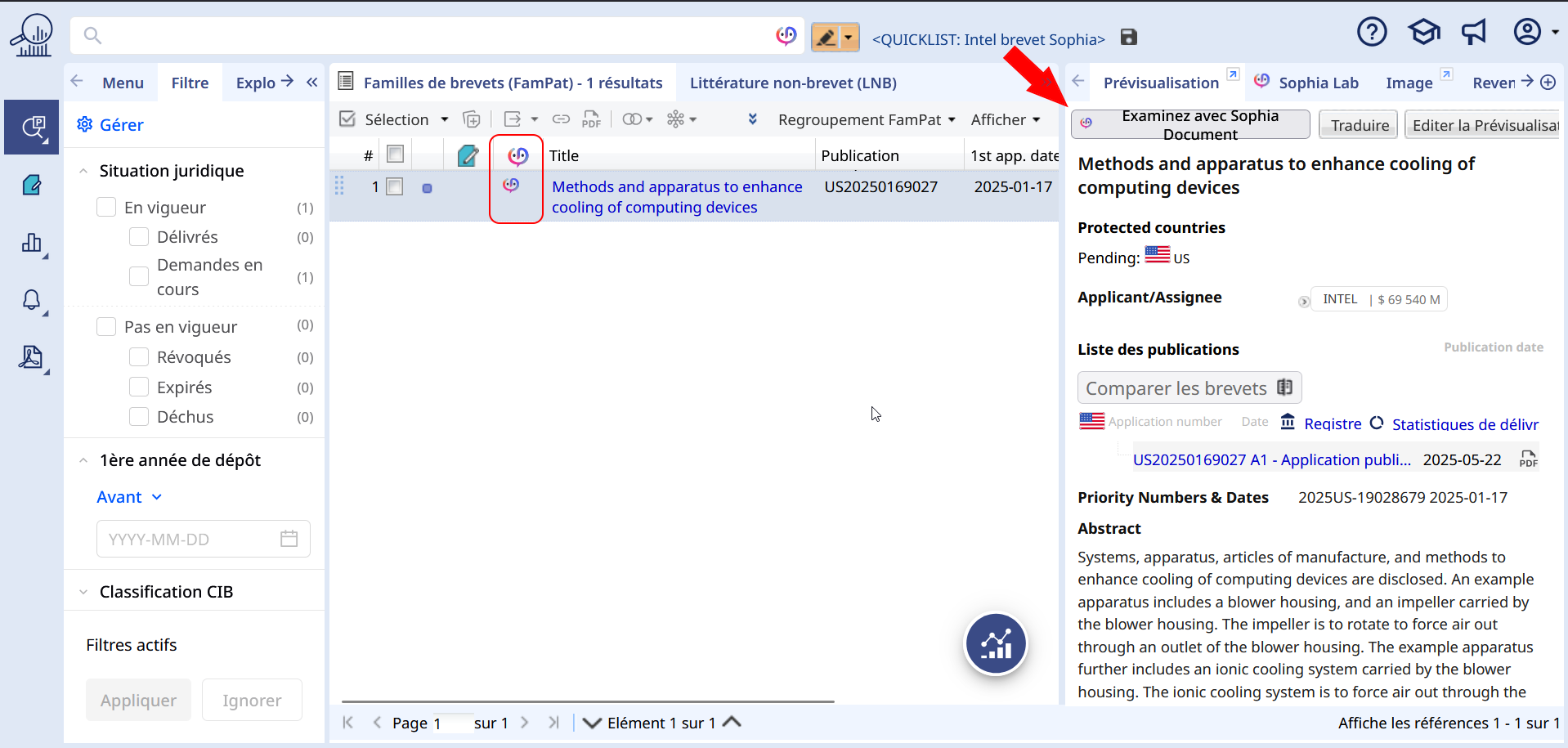 Depuis une liste de résultats, une icône Sophia (entre la puce Legal Status et l'icône Dossiers) sera présente sur les familles ayant une conversation présente tel que :
