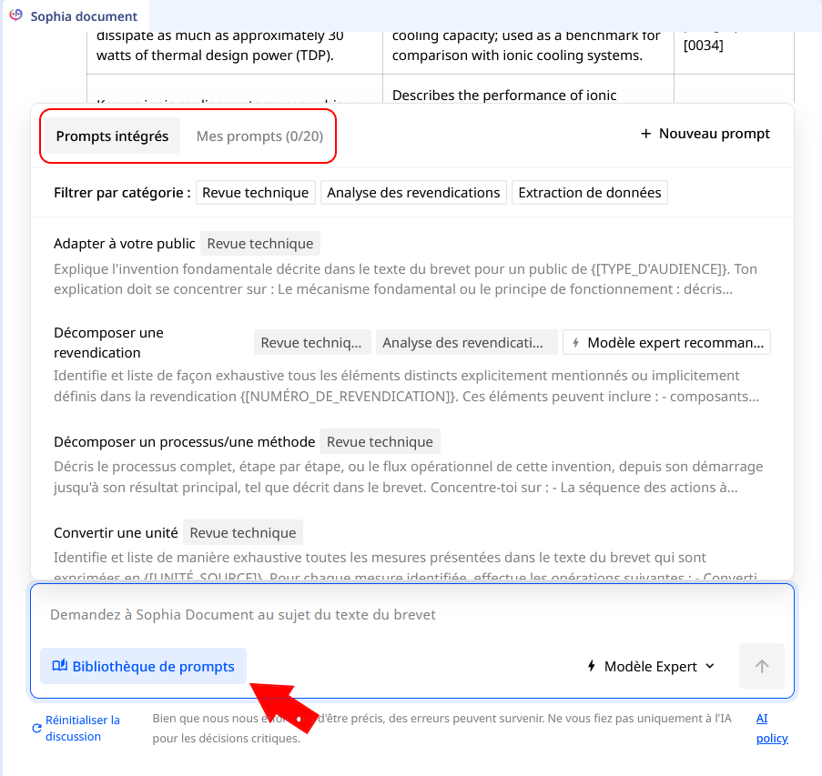 Sophia document est un outil d'IA interactif, permettant d'améliorer la compréhension et l'extraction des informations importantes d'un brevet. Vous pouvez interagir avec lui, via des questions en langage naturel, ou par des prompts, afin de réaliser de nombreuses tâches relatives à la lecture du document