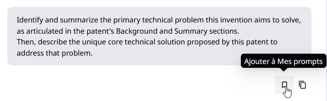 - Les prompts sauvés sont indépendants de la bibliothèque offerte par Orbit. Vos prompts ne sont partagés à personne, de votre équipe comme Questel.