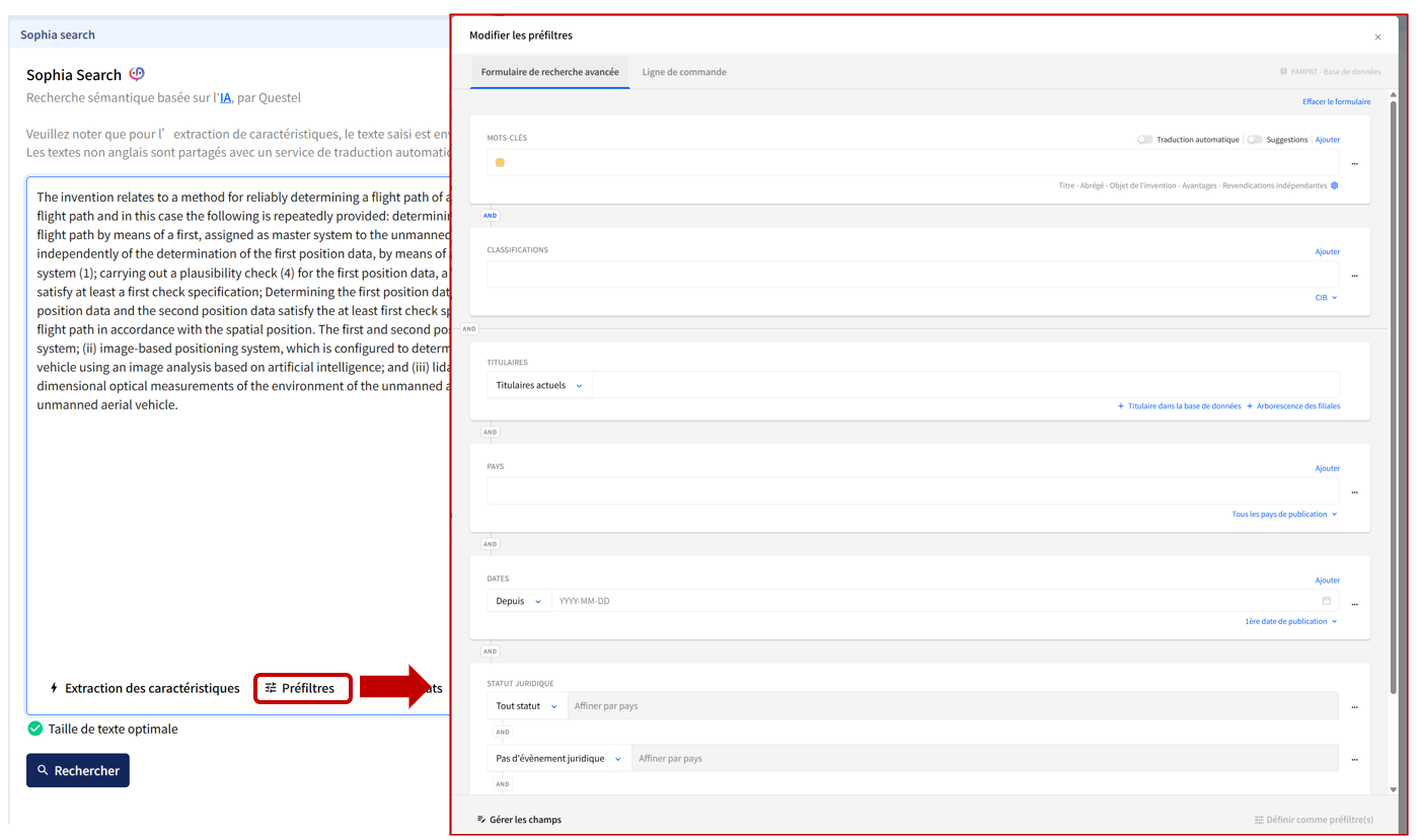 Saisissez votre texte dans l'interface Sophia Search, et cliquez sur le bouton Préfiltres en bas de la fenêtre.