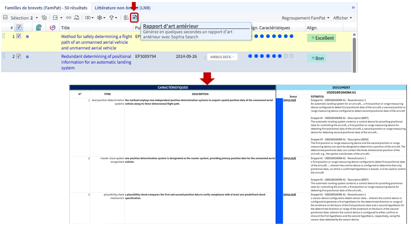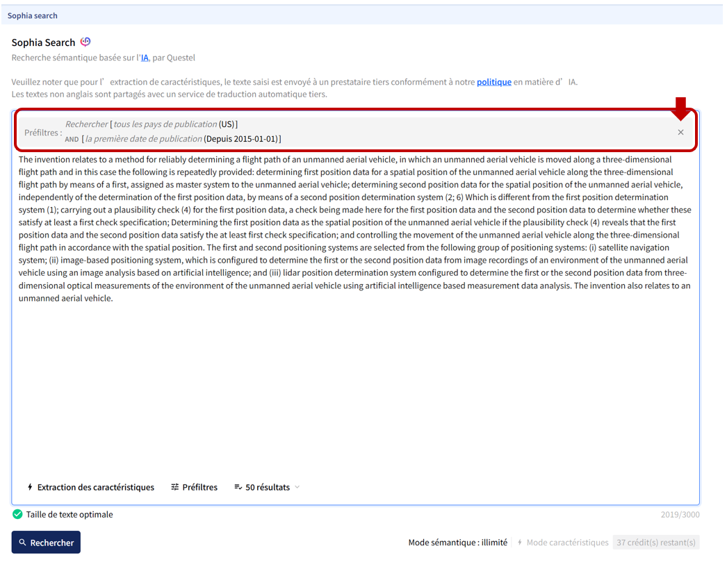 - Mode Caractéristiques : extrait automatiquement les caractéristiques du texte saisi, puis analyse le contenu des brevets afin d’identifier les éléments déjà divulgués.