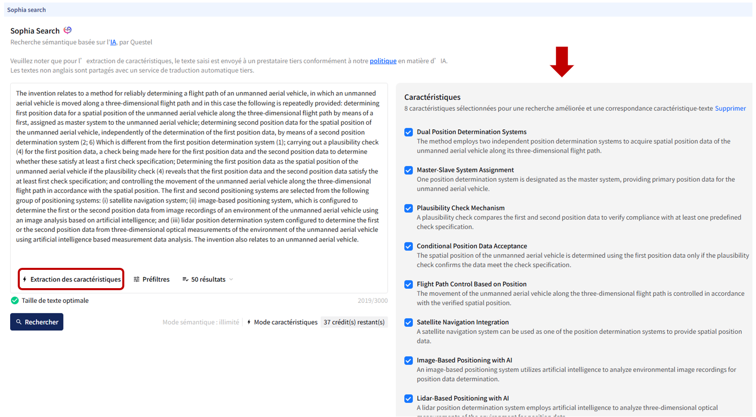 Sophia Search peut extraire les « caractéristiques » décrites dans votre saisie. Une caractéristique fait référence à une particularité technique ou à un composant distinct qui contribue à l'innovation ou à la différenciation du sujet dans le texte.