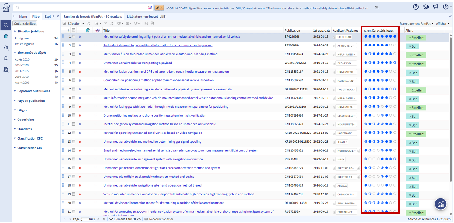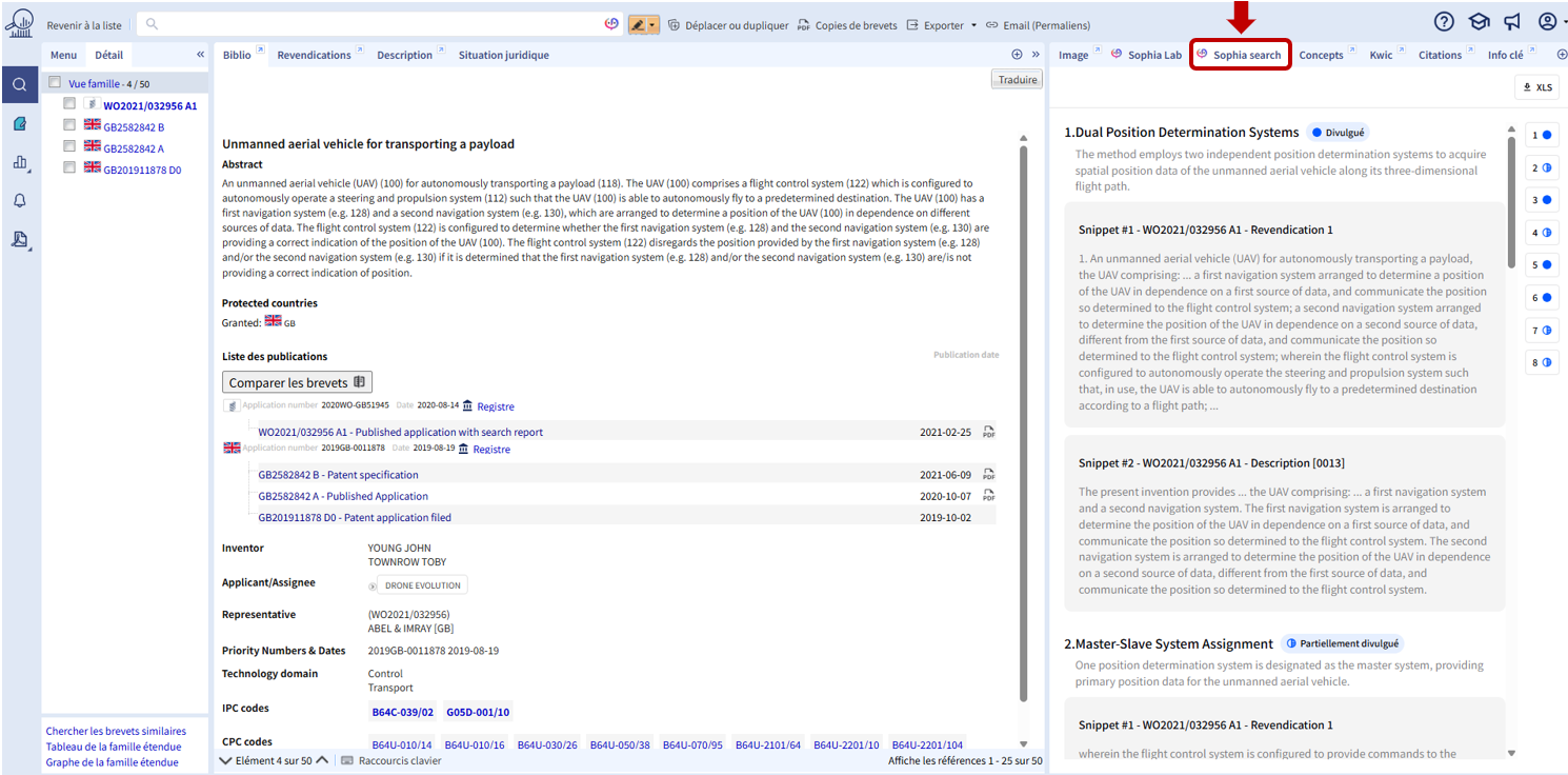 Pour plus d'informations sur un résultat spécifique, vous pouvez activer l'onglet Sophia Search dans le volet droit de la liste de résultats, ou vous pouvez accéder à la vue Famille en cliquant sur la famille de brevets qui vous intéresse.