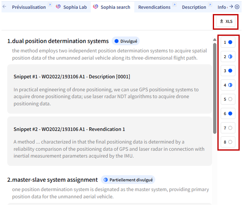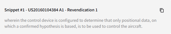 - Vous verrez le numéro de l'extrait (snippet), la publication ainsi que le numéro de revendication ou de paragraphe dont il est issu.