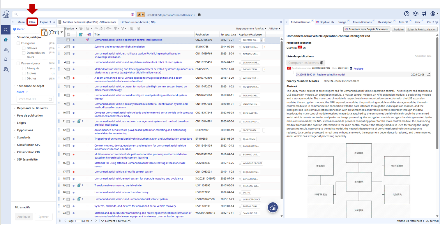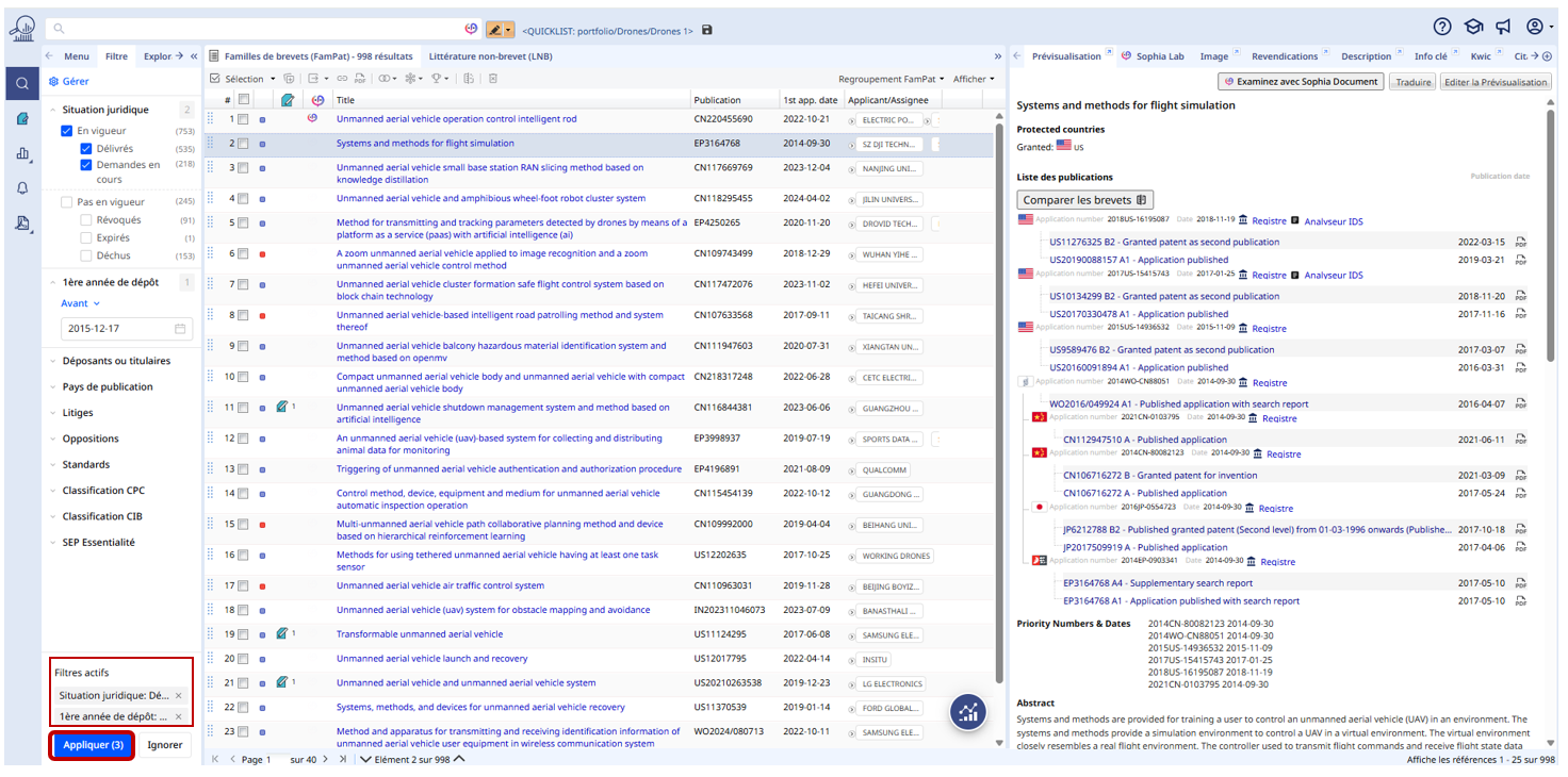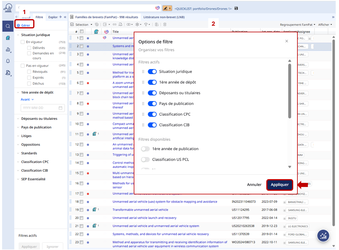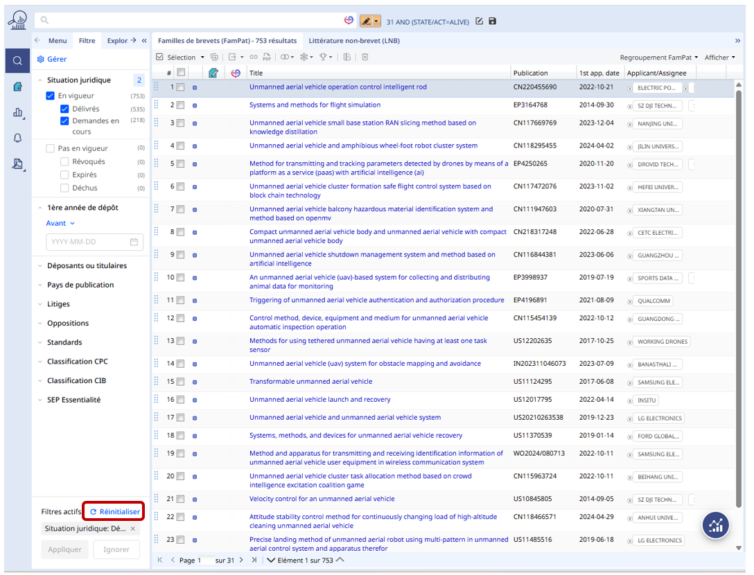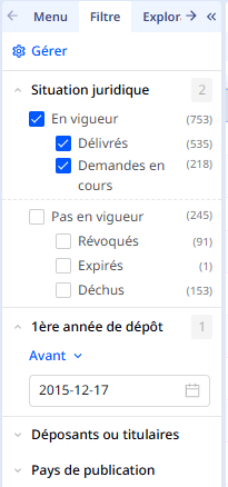 Les filtres peuvent être appliqués pour réduire de grands ensembles de données en se concentrant sur des critères spécifiques tels que la situation juridique, le pays de publication ou le déposant ou titulaire.
