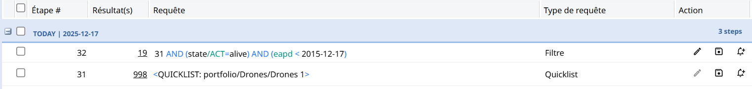 La requête correspondant aux filtres appliqués est disponible dans la section Historique de recherche, ce qui vous permet de retrouver ou réutiliser facilement vos recherches précédentes.