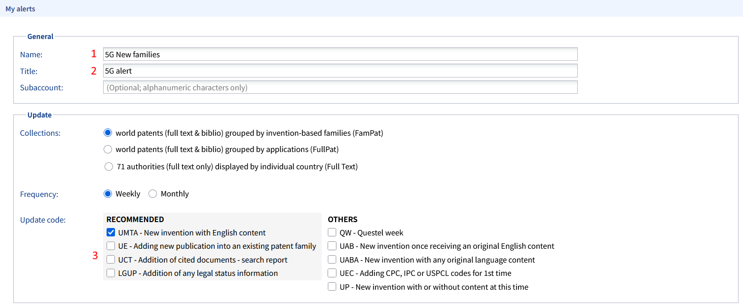 複数の更新コードを基に設定できますが、各コードにはそれぞれ固有の定義(追跡対象のイベントと頻度)があることにご留意ください。UMTA UEはそのよい例であり、この設定ではUMTA=英語要約のある新規特許ファミリー、または、UE=新たな公開段階を受領した既存のファミリーを追跡します。