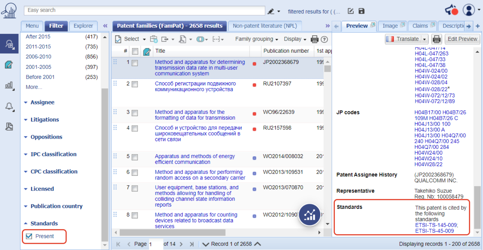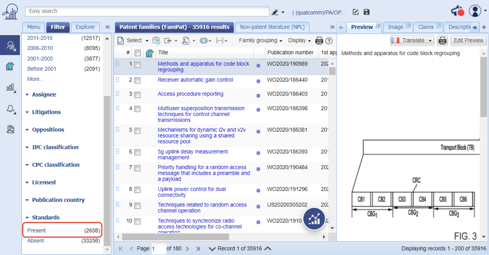 Orbit Intelligenceでは、規格で宣言された特許をコマンドラインから直接検索するか、結果のリストをフィルタリングすることで検索できます。