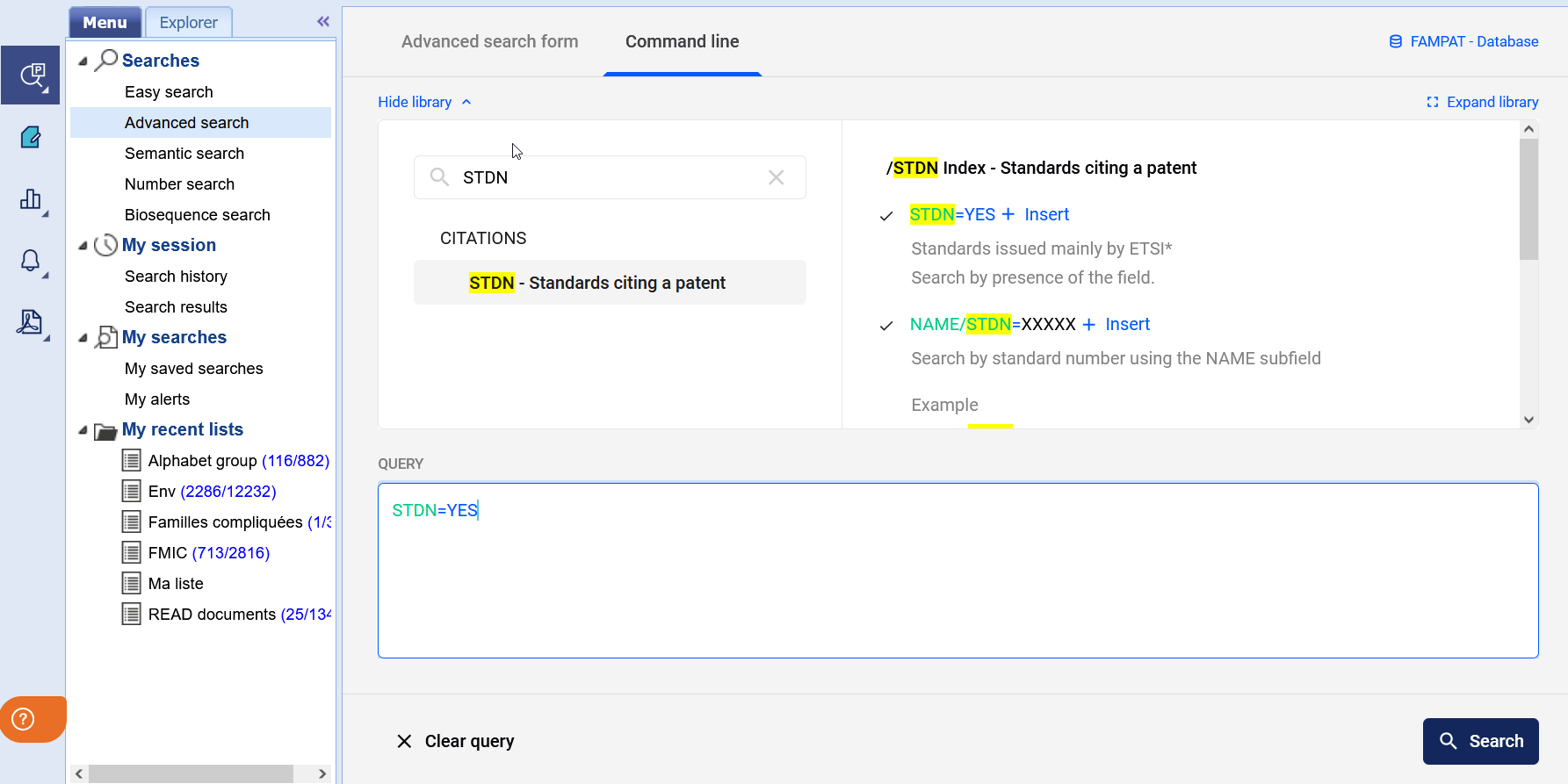 特定の組織の規格を含むすべての特許を検索するには、コマンドライン ORG/STDN=ETSI を使用します(上級者向け検索 > コマンドライン、または検索履歴 > コマンドラインエディターから)。