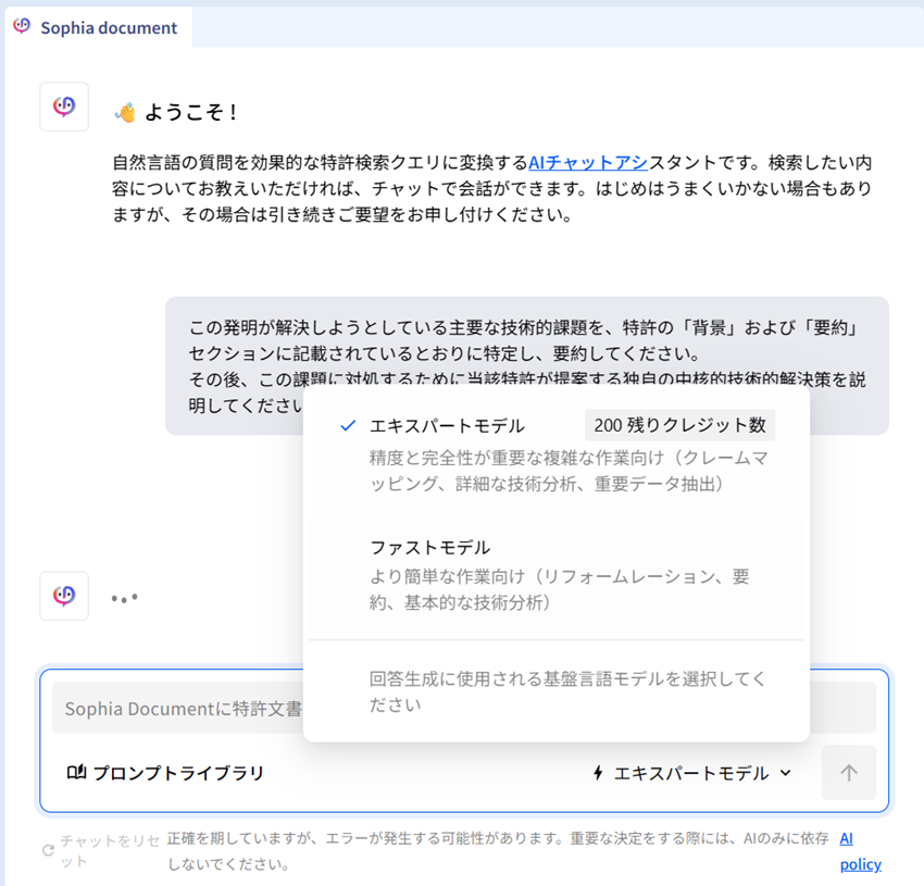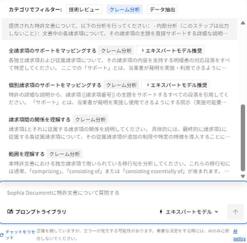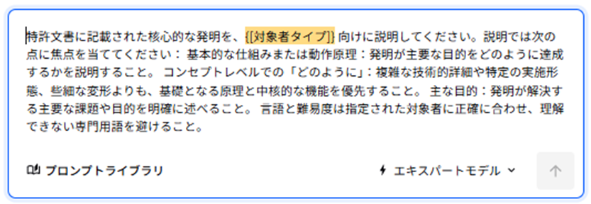 一部のプロンプトでは、エキスパートモデルを有効にすると、より正確で優れた結果が得られます。このモデルは、全文(最も大きな特許を除く。下記の最後のセクションを参照)を解析し、コンテンツを効率的に精査して、要求されている情報を正確に見つけ出すことができます。