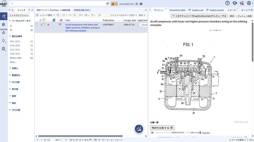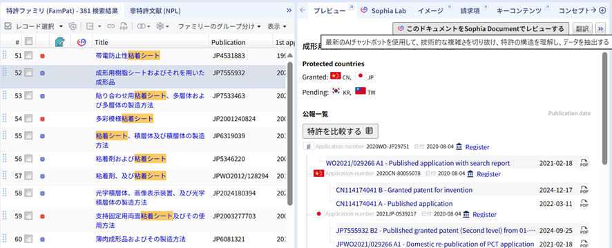ヒットリストでは、どの特許ファミリにアクティブなチャットがあるかを確認できます。専用の Sophia アイコンが、作業ファイル アイコンと法的ステータス インジケーターの間に表示されます。