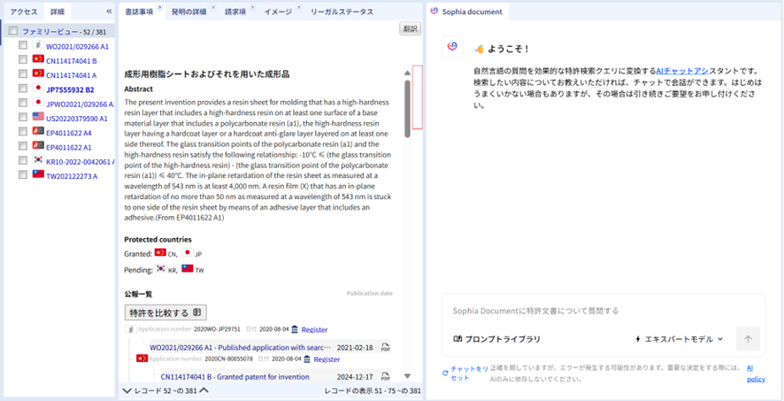 Sophia Documentタブを開くと、デフォルトで特許ファミリーの「代表メンバー」がチャット対象として選択されます。このデフォルトの選択を変更する場合は、ユーザー設定の「表示」セクションをご覧ください。別のファミリーメンバーとチャットするには、左パネルでそのメンバーの名前をクリックします。中央パネルがそのメンバーのコンテキストで再読み込みされます。