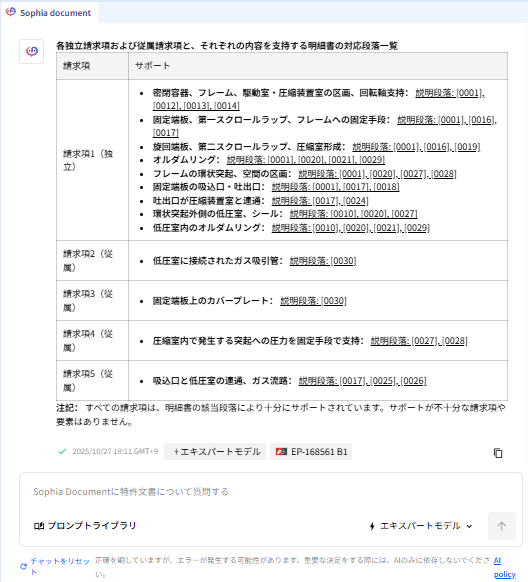 Sophia ドキュメントは、特許全文に基づいて回答するために、段落とクレーム番号へのリンクを常に作成します。