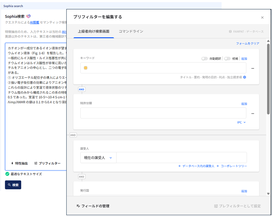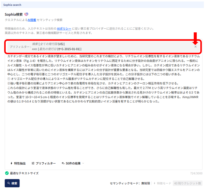 Sophia Searchインターフェースにテキストを入力した後、ウィンドウ下部にある「プリフィルター」ボタンをクリックしてください。