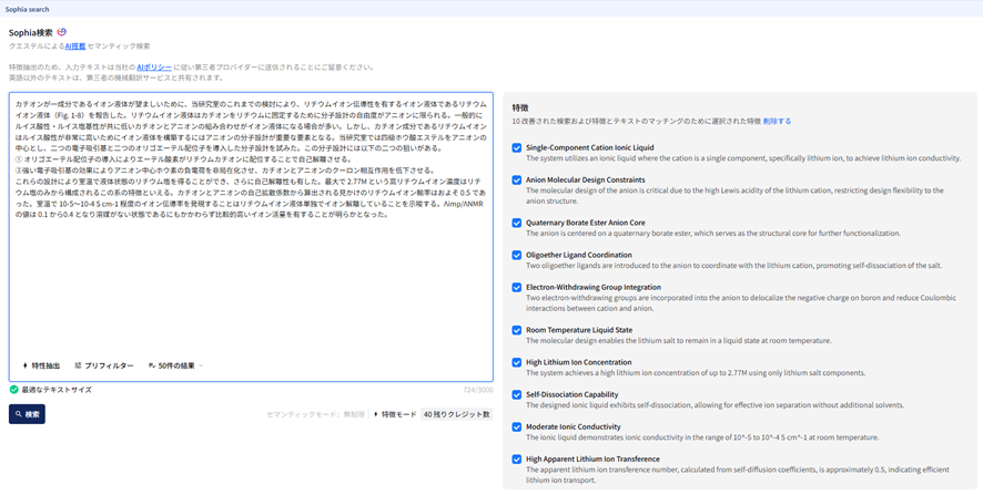 Sophia Searchは、入力されたテキストに記載されている「特徴」を抽出できます。特徴とは、イノベーションに貢献する、またはテキスト中の主題を差別化する、明確な技術的特性や構成要素を指します。