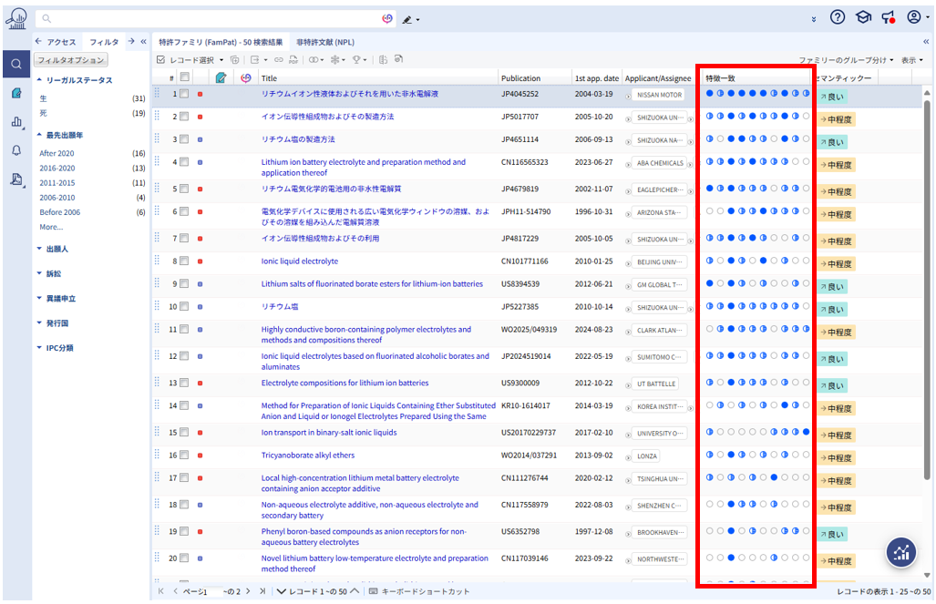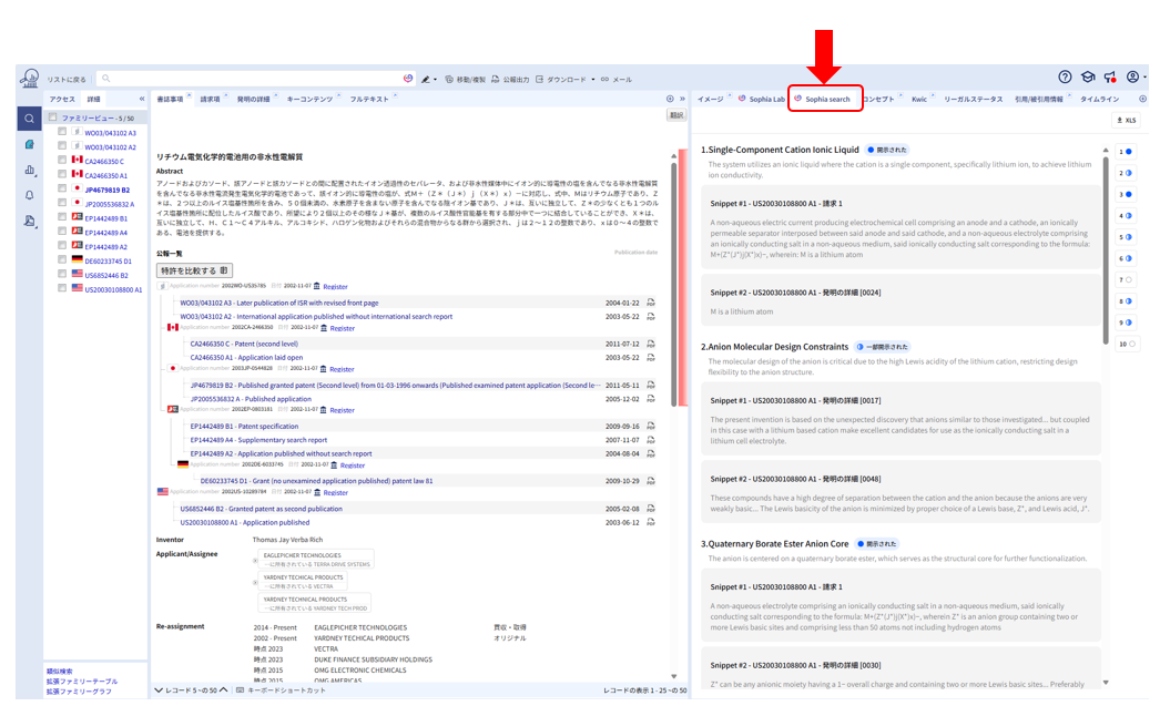 特定の結果に関する詳細情報を確認するには、ヒットリストの右側にあるペインの「Sophia Search」タブを有効にするか、関心のある特許ファミリーをクリックしてファミリービューに移動してください。