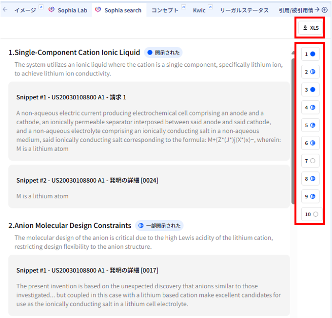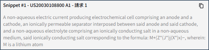 - スニペット番号、公開段階、およびスニペットが抽出された請求項または段落番号が表示されます。注:FAMPATでは、表示される公開段階は埋め込み計算に使用されたものです。