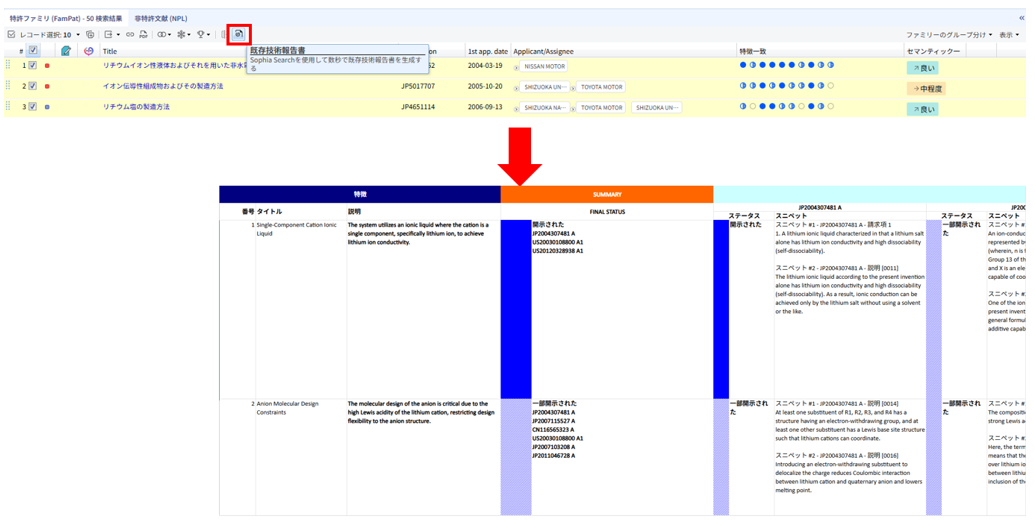 検索結果一覧から最大10件の結果を選択すると、すぐに先行技術調査レポート(すぐに使えるExcelファイル形式)を生成できます。
