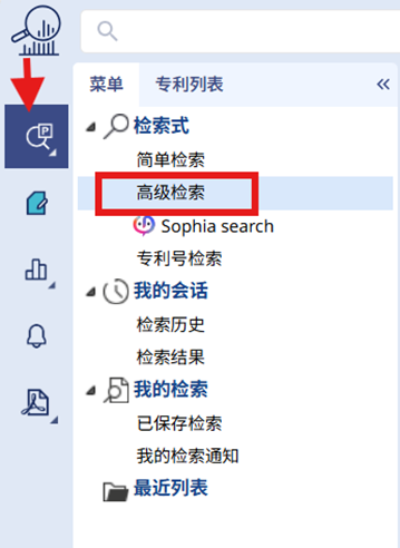 要访问高级检索表单,请确认您已位于模块栏中的检索模块(放大镜图标),然后单击左侧面板中的“高级检索”。