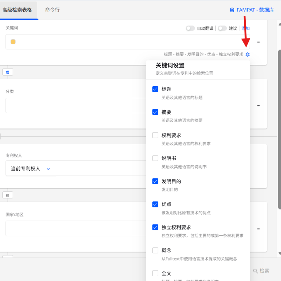 - 对于关键词,点击齿轮图标以选择在专利文献的哪个部分进行检索。您的选择将显示在齿轮图标旁边以便快速参考。