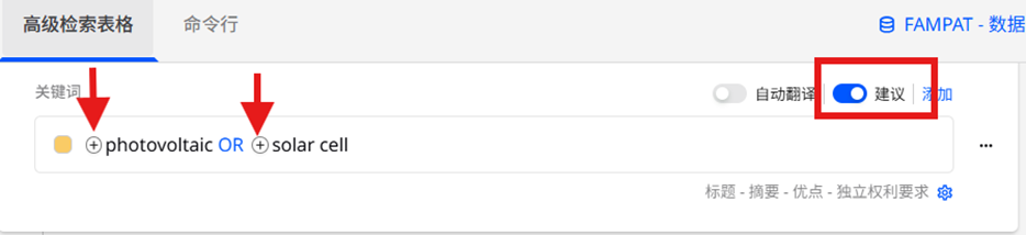当“建议”功能激活时,建议词汇前会出现“+”图标。点击“+”图标可查看翻译以及与关键词相关的同义词列表。然后点击选择您希望包含在检索式中的术语。默认情况下,新术语或概念使用 OR 运算符组合;但可以根据需要进行修改。