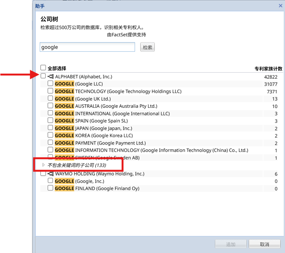 - 您可以选择母公司以自动将其所有子公司包含在检索式中。
