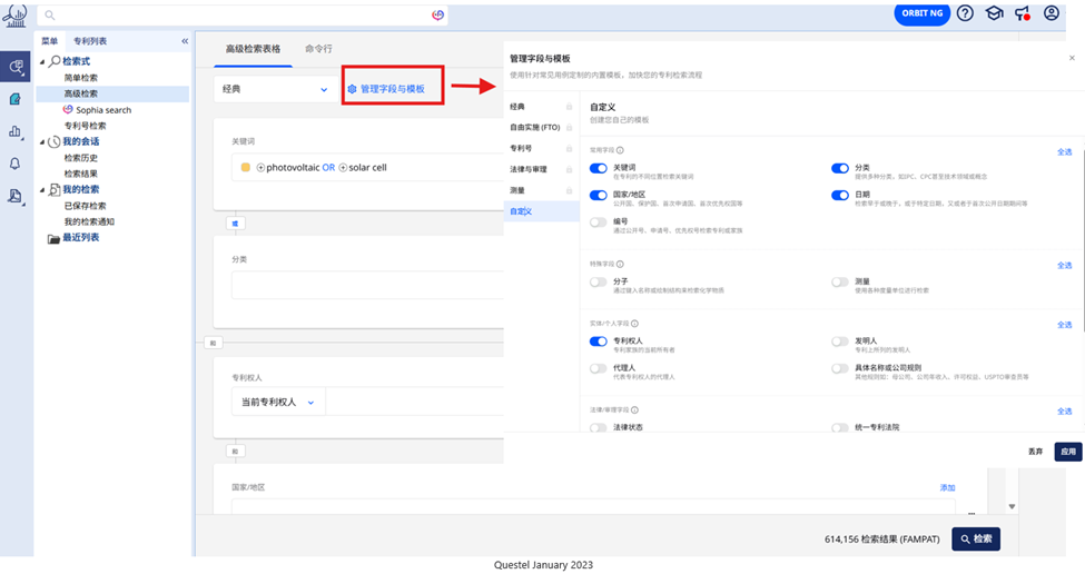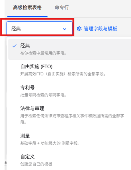 高级检索表单左侧的下拉列表中提供了不同的模板。每个模板定义了表单的一种特定“状态”——即哪些字段被开启或关闭。用户可以根据需要在模板之间轻松切换,或自定义其字段选择(自定义模板)。