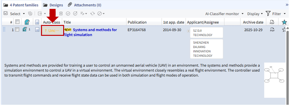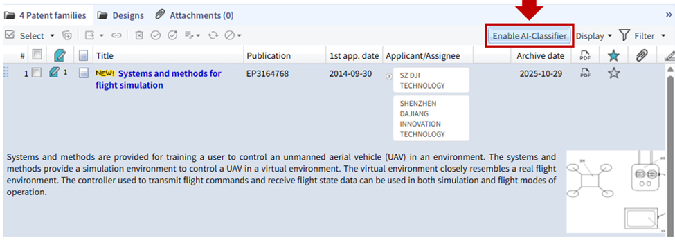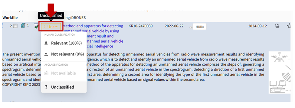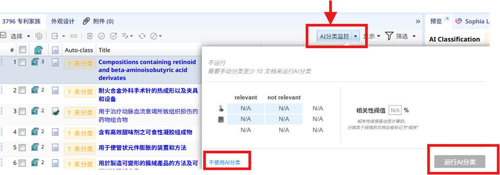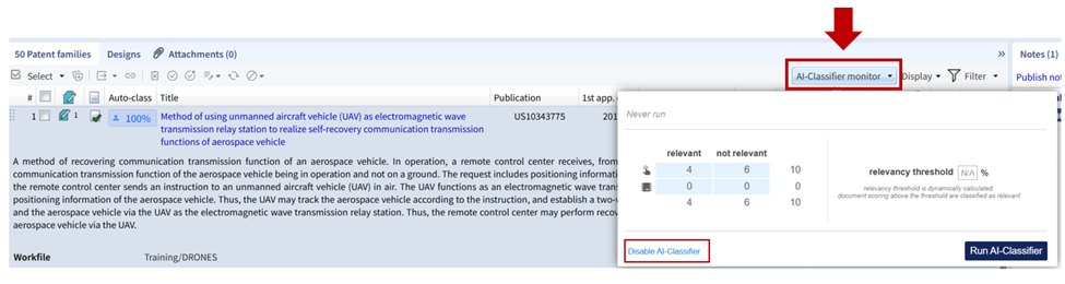 AI-Classifier 可自动将工作文件中的专利分类为"相关"和"不相关"两类。它依赖于机器学习算法,AI-Classifier 会根据用户手动分类的文档创建分类规则。