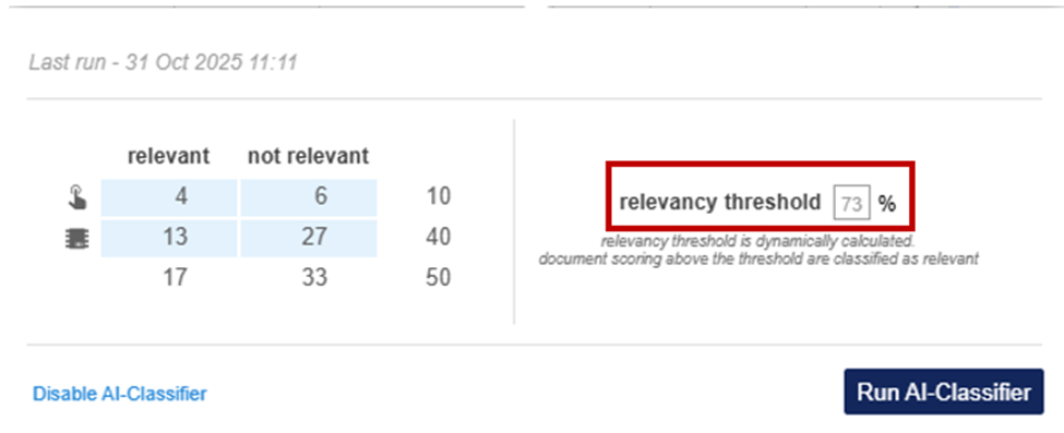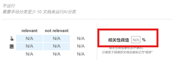 注意:如果在第二次运行 AI-Classifier 后,此阈值急剧下降,说明您将一个或多个与原始"面部特征图"(见介绍部分)相差甚远的文档标记为了相关。