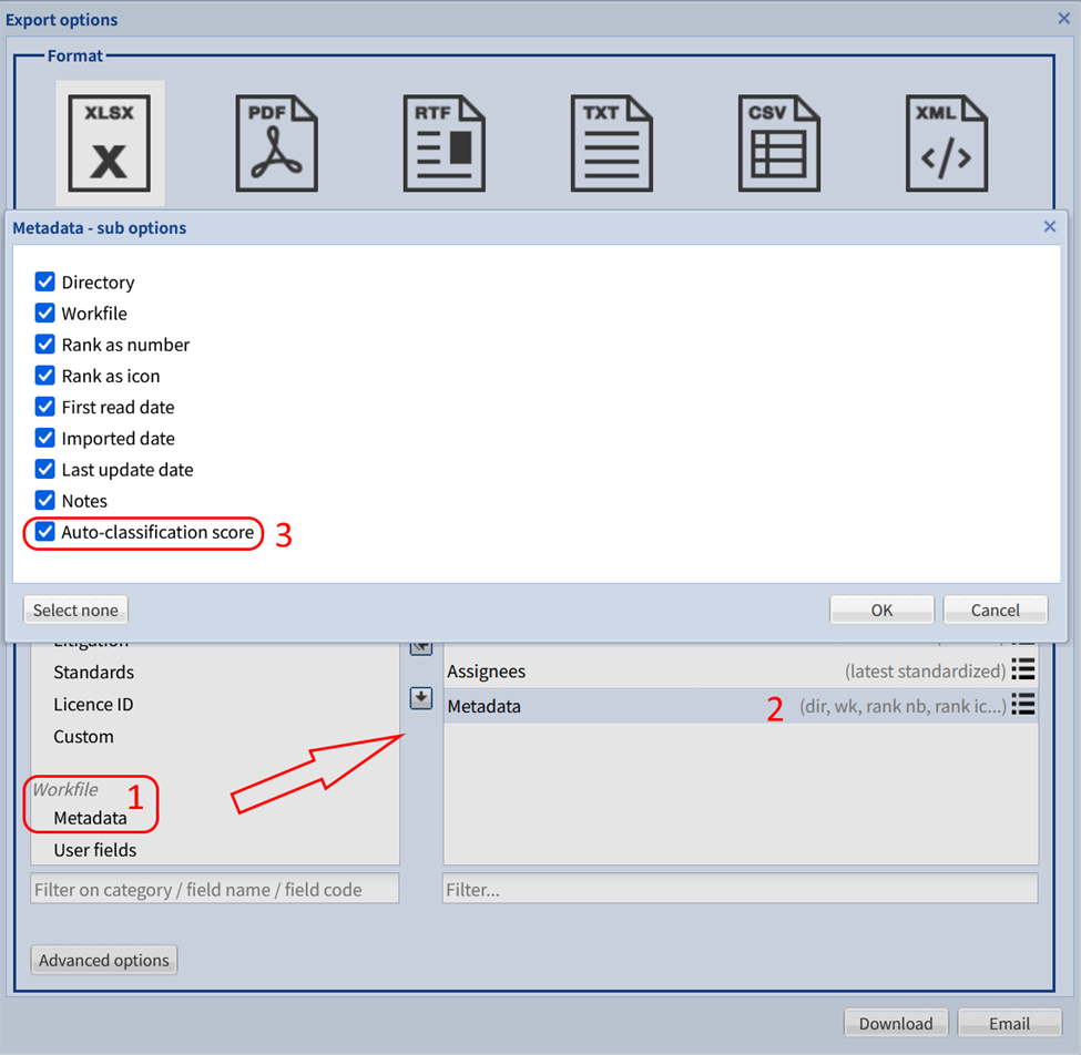 是的,您可以导出每个文档的分类评分。请在配置导出时,从可用字段中选择"元数据"项。